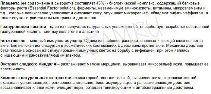 Плацентарная вытяжка (45% от состава сыворотки), а также гиалуроновая кислота, аденозин и масло сладкого миндаля активируют естественный синтез коллагена в коже.