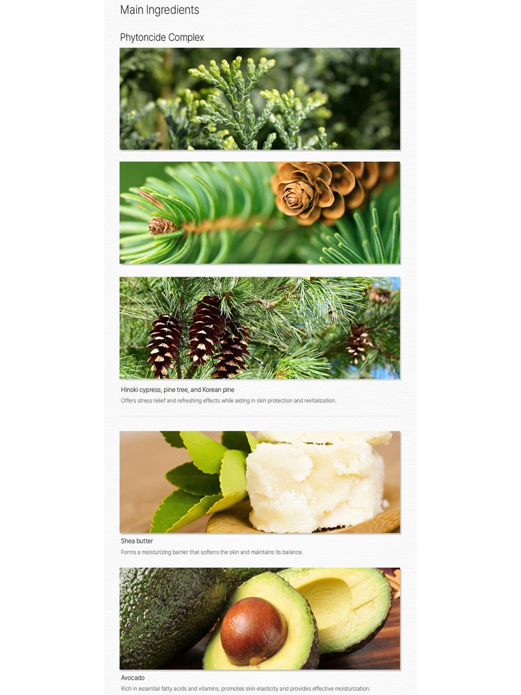Вода, глицерин, жидкий парафин, цетеариловый спирт, масло ши (Butyrospermum Parkii), диметикон, циклопентасилоксан, дипропиленгликоль, каприловый/каприновый триглицерид, цетеарилглюкозид, глицерилстеарат, ПЭГ-100 стеарат, кроссполимер акрилатов/C10-30 алкилакрилата, мочевина, гидроксид калия, масло авокадо (Persea Gratissima), глюкоза, экстракт листьев кипариса (Chamaecyparis Obtusa), экстракт листьев кипариса вечнозеленого (Cupressus Sempervirens), экстракт листьев сосны густой (Pinus Densiflora), динатрий ЭДТА, феноксиэтанол, хлорфенезин, 1,2-гександиол, CI 19140, CI 15985, отдушка, цитраль, лимонен, гераниол.