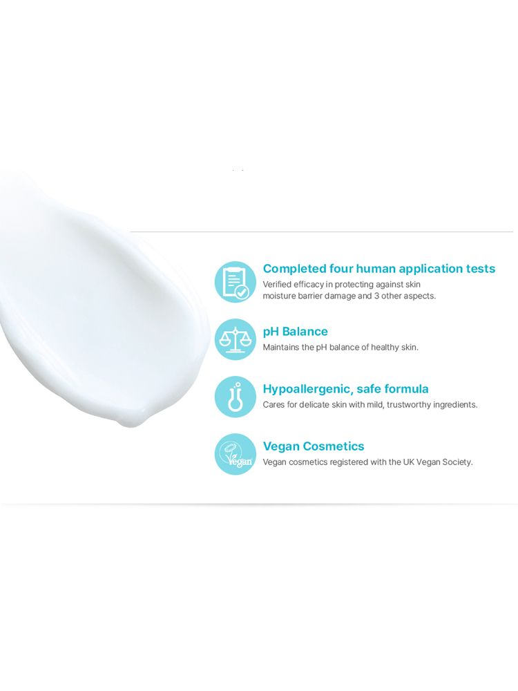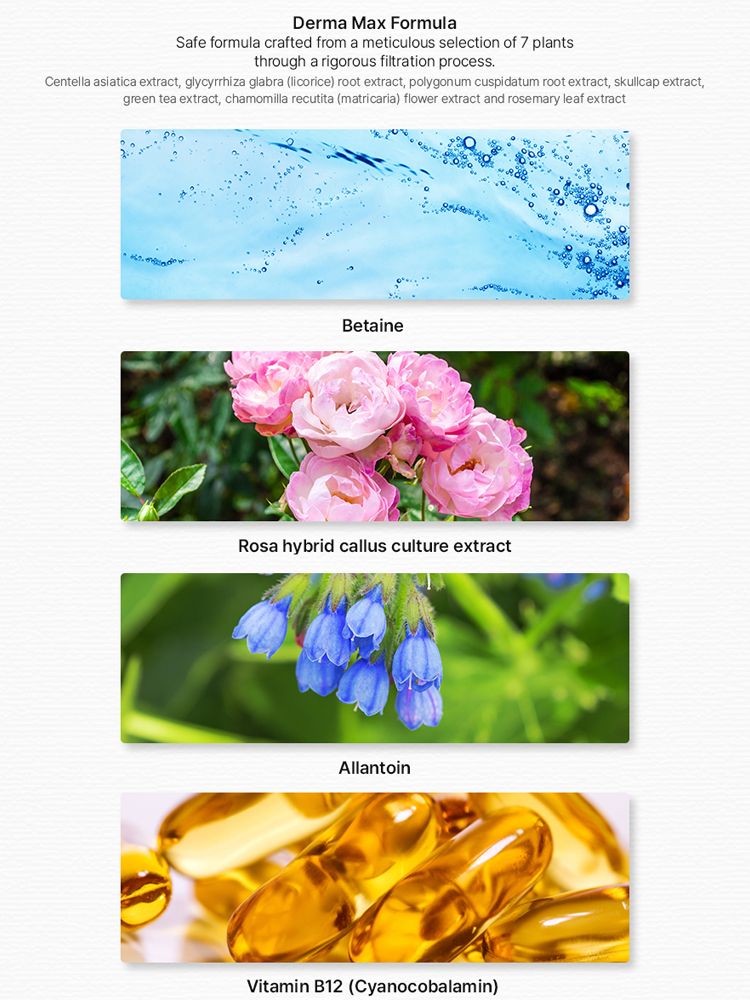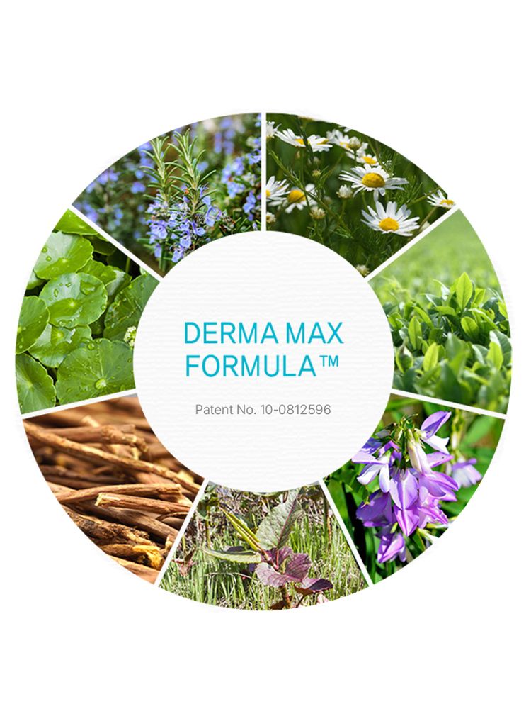 - Запатентованный комплекс Derma Max Formula, который представляет собой сочетание растительных экстрактов (эхинацеи, зеленого чая, ромашки, розмарина, центеллы азиатской и др.), масла ши, аллантоина и других восстанавливающих компонентов.