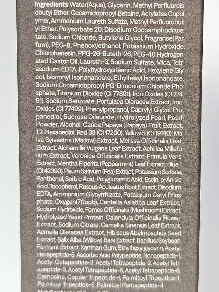 Состав: Water(Aqua), Glycerin, Methyl Perfluoroisobutyl Ether, Cocamidopropyl Betaine, Acrylates Copolymer, Ammonium Laureth Sulfate, Methyl Perfluorobutyl Ether, Polysorbate 20, Disodium Cocoamphodiacetate, Sodium Chloride,Butylene Glycol, Fragrance(Parfum),PEG-8, Phenoxyethanol, Potassium Hydroxide, Chlorphenesin, PPG-26-Buteth-26, PEG-40 Hydrogenated Castor Oil, Laureth-3, Sodium Sulfate, Mica, Tetrasodium EDTA, Polyhydroxystearic Acid, Hexylene Glycol, Isononyl Isononanoate, Ethylhexyl Isononanoate, Sodium Cocamidopropyl PG-Dimonium Chlorde Phosphate, Titanium Dioxide (CI 77891), Iron Oxides (CI 77491), Sodium Benzoate, Portulaca Oleracea Extract, Iron Oxides (CI T7499), Phenylpropanol, Caprylyl Glycol Propanediol, Sucrose Dilaurate, Hydrolyzed Pearl, Pearl Powder, Alcohol, Carica Papaya (Papaya) Fruit Extract, 1,2-Hexanediol, Red 33 (CI 17200), Yellow 5 (CI 19140), Malva Sylvestris (Mallow) Extract, Melissa Officinalis Leaf Extract, Alchemilla Vulgaris Leaf Extract, Achillea Millefolium Extract, Veronica Offioinalis Extract, Primula Veris Extract, Mentha Piperita (Peppermint) Leaf Extract, Blue 1 (C42090), Pisum Sativum(Pea) Extract, Potassium Sorbate, Panthenol, Sorbic Acid, Polyglutamic Acid, Escin, p-Anisia Acid, Tocopherol, Ruscus Aculeatus Root Extract Disodium EDTA, Ammonium Glycyrrhizate, Potassium Cetyl Phosphate, Oxygen(70ppb), Centella Asiatica Leaf Extract, Sodium Hydroxde, Fomes Officinalis (Mushroom) Extract, Hydrolyzed Yeast Protein, Calendula Officinalis Flower Extract, Sodium Citrate, Camellia Sinensis Leaf Extract, Acmella Oleracea Extract, Hibiscus Abelmoschus Seed Extract, Salix Alba (Willow) Bark Extract, Bacillus/Soybean Ferment Extract, Xanthan Gum, Ethylhexylglycerin, Acetyl Hexapeptide-8, Ascorbic Acid Polypeptide, Nonapeptide-1, Acetyl Octapeptide-3, Acetyl Tetrapeptide-2, Acetyl Tetrapeptide-3, Acetyl Tetrapeptide-5, Acetyl Tetrapeptide-9, Carnosine, Copper Tripeptide-1, Palmitoyl Tripeptide-1, Palmitoyl Tripeptide-5, Palmitoyl Pentapeptide-4.