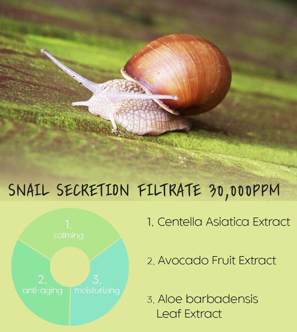 Состав: Water, Snail Secretion Filtrate(3%), Butylene Glycol, Glycerin, Aloe Barbadensis Leaf Extract, Arginine, Carbomer, Phenoxyethanol, Polysorbate 20, Chlorphenesin, Betaine, Fragrance, Maltodextrin, Citric Acid, Salicylic Acid, Disodium EDTA, Gluconolactone, Portulaca Oleracea Extract, Persea Gratissima (Avocado) Fruit Extract, Hippophae Rhamnoides Fruit Extract, Centella Asiatica Extract, Bambusa Vulgaris Extract, Chamomilla Recutita (Matricaria) Flower Extract, 1,2-Hexanediol, Cucumis Sativus (Cucumber) Fruit Extract, Morus Alba Root Extract, Melissa Officinalis Leaf Extract, Ethylhexylglycerin