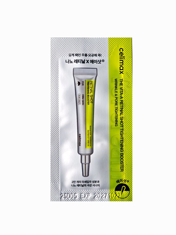 - CELIMAX The Vita-A Retinol Shot Tightening Booster: Water, Butylene Glycol, Glycerin, Caprylic/Capric Triglyceride, Cetearyl Alcohol, Niacinamide, Diisostearyl Malate, 1,2-Hexanediol, Polypropylsilsesquioxane, Panthenol, Cetearyl Olivate, Cetearyl Glucoside, Sorbitan Olivate, Hydroxyethyl Acrylate/Sodium Acryloyldimethyl Taurate Copolymer, Lecithin, Carbomer, Arginine, Dimethicone/Vinyl Dimethicone Crosspolymer, Tocopherol, Retinal (0.1%), Xanthan Gum, Ethylhexylglycerin, Adenosine, Sorbitan Isostearate, Sodium Lactate, Hydrolyzed Sponge, Disodium EDTA, Polysorbate 20, Ascorbic Acid, Glucose, Palmitoyl Tripeptide-1, Palmitoyl Tetrapeptide-7.
