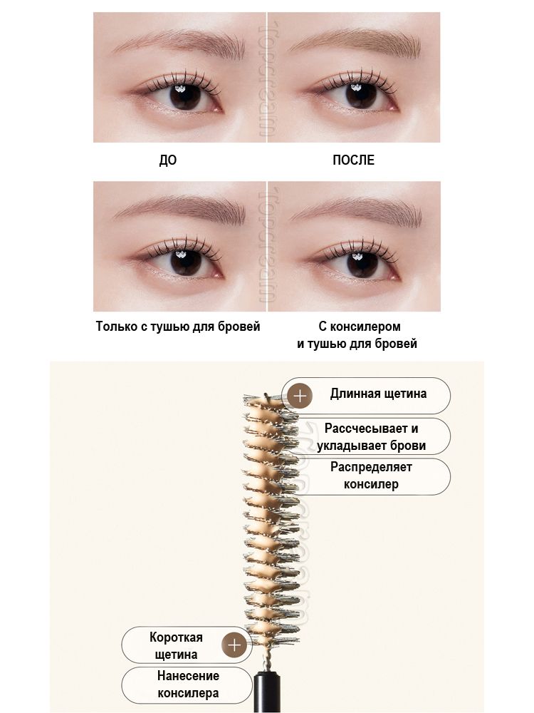 Очистите кожу в зоне бровей и дайте ей высохнуть. Используя сторону с короткой щетинками нанесите консилер в направлении противоположенном направлению роста бровей (от кончика до основания). Затем стороной с длинными щетинками расчешите бровь по направлению роста (от основания брови до ее кончика). Через несколько минут можно завершить макияж тушью для бровей.