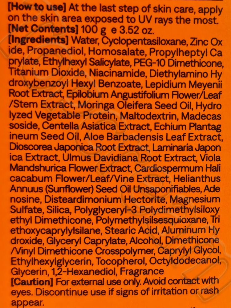 Состав: Water, Cyclopentasiloxane, Zinc Oxide, Propanediol, Homosalate, Propylheptyl Caprylate, Ethylhexyl Salicylate, PEG-10 Dimethicone, Titanium Dioxide, Niacinamide, Diethylaminohydroxybenzoyl Hexyl Benzoate, Maca Root Extract, Pink Needle Flower/Leaf/Stem Extract, Drumstick Seed Oil, Hydrolyzed Vegetable Protein, Maltodextrin, Madecassoside, Centella Asiatica Extract, Echium Plantargonium Seed Oil, Aloe Vera Leaf Extract, Yam Root Extract, Kelp Extract, Sugar Elm Root Extract, Violet Flower Extract, Balloon Vine Flower/Leaf/Vine Extract, Sunflower Seed Oil Unsaponifiable, Adenosine, Disteadimonium Hectorite, Magnesium Sulfate, Silica, Polyglyceryl -3 Polydimethylsiloxyethyldimethicone, Polymethylsilsesquioxane, Triethoxycaprylylsilane, Stearic Acid, Aluminum Hydroxide, Glyceryl Caprylate, Ethanol, Dimethicone/Vinyldi Methicone Cross Polymer, Caprylyl Glycol, Ethylhexyl Glycerin, Tocopherol, Octyldodecanol, Glycerin, 1,2-Hexanediol, Fragrance.