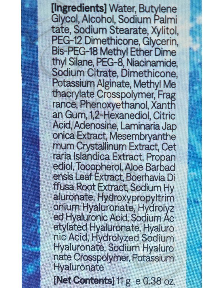 Состав: Water, Butylene Glycol, Alcohol, Sodium Palmitate, Sodium Stearate, Xylitol, PEG-12 Dimethicone, Glycerin, Bis-PEG-18 Methyl Ether Dimethyl Silane, PEG-8, Niacinamide, Sodium Citrate, Dimethicone, Potassium Alginate, Methyl Methacrylate Crosspolymer, Fragrance, Phenoxyethanol, Xanthan Gum, 1,2-Hexanediol, Citric Acid, Adenosine, Laminaria Japonica Extract, Mesembryanthemum Crystallinum Extract, Cetraria Islandica Extract, Propanediol, Tocopherol, Aloe Barbadensis Leaf Extract, Boerhavia Diffusa Root Extract, Sodium Hyaluronate, Hydroxypropyltrimonium Hyaluronate, Hydrolyzed Hyaluronic Acid, Sodium Acetylated Hyaluronate, Hyaluronic Acid, Hydrolyzed Sodium Hyaluronate, Sodium Hyaluronate Crosspolymer, Potassium Hyaluronate.
